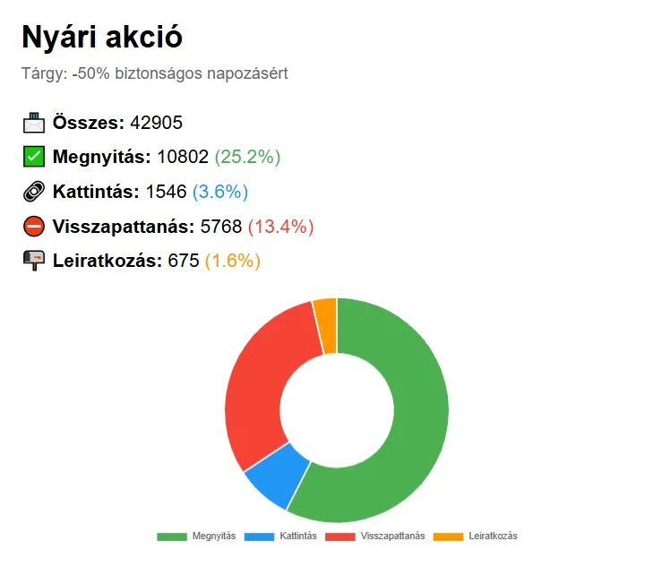 Minden ügyfelünk saját riportfelületet kap, ahol valós időben látható a kampány teljesítménye: megnyitások, kattintások, leiratkozások.